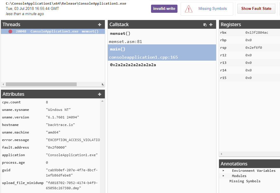 - Misc: Backtrace applies downloaded symbols to all threads, but only downloads new symbols from the faulting thread. If the missing symbol is in a nonfaulting thread, it will not be downloaded from a custom symbol server. To workaround this, a symbol can be manually downloaded from the symbol server, uploaded to Backtrace, and then the crash can be reprocessed. Alternatively, the crash can be resubmitted with the thread in question marked faulting (using a modifier) and later deleted as needed. After the symbol is downloaded from the symbol server, it will apply to all threads of new or reprocessed crashes.