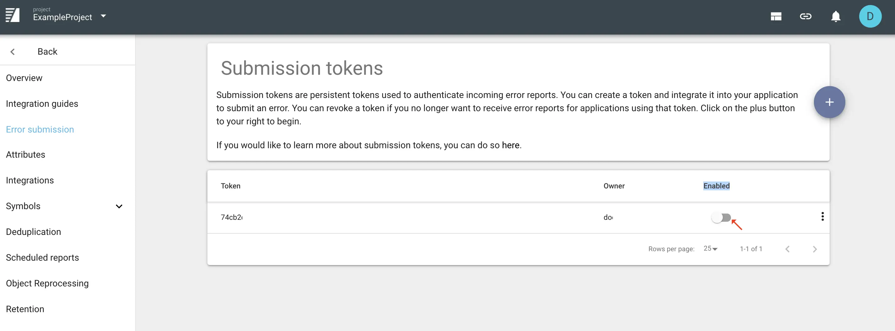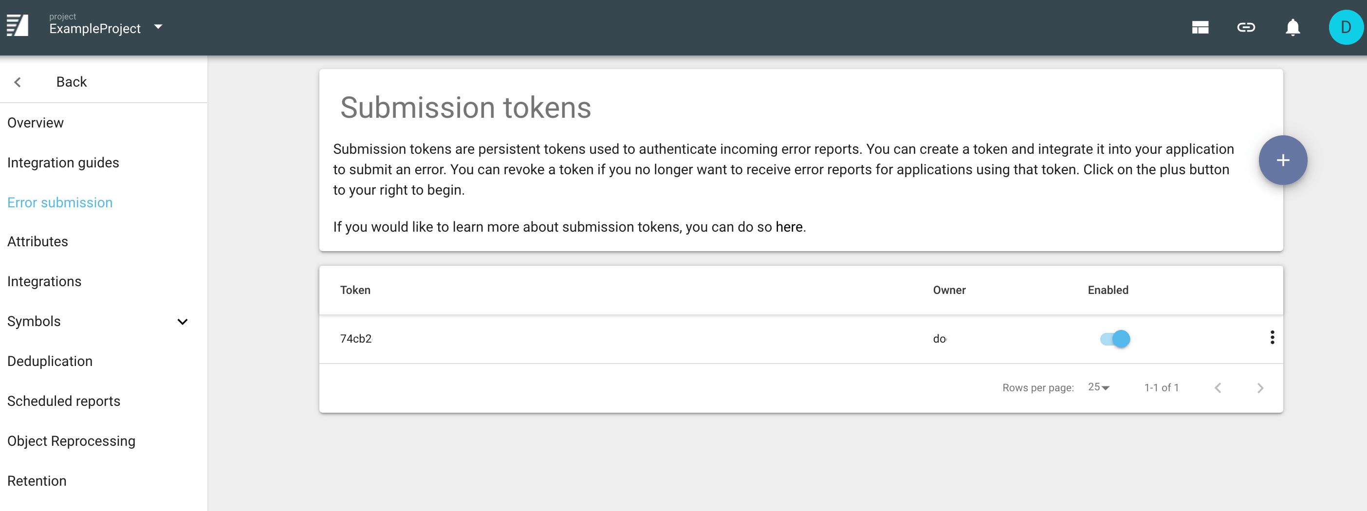 You can create and manage submission tokens in the Project Settings window's Error submission section.