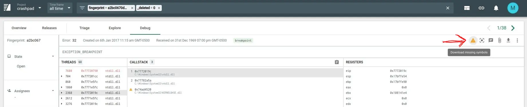 _BACKTRACE_PROMPT_MISSING_SYMBOLSwindow variable must be set totrue. This can be changed by SSH into your coronerd instance and editing the.../coronerd/coronerd.conffile. The system must detect missing symbols on the non-faulting thread when you open an error report in the debugger (this is checked / happens automatically) If all of the above are true, you will see an icon/button show up on the top right corner of the debugger as shown below.