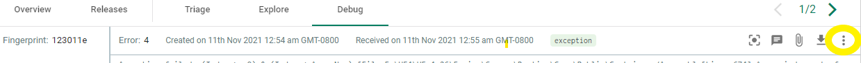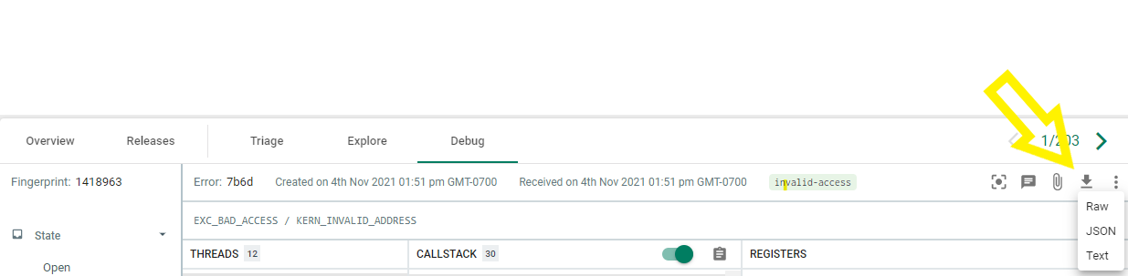 You can a single crash report from Backtrace UI Debug view by clicking on the three dot icon to the right: