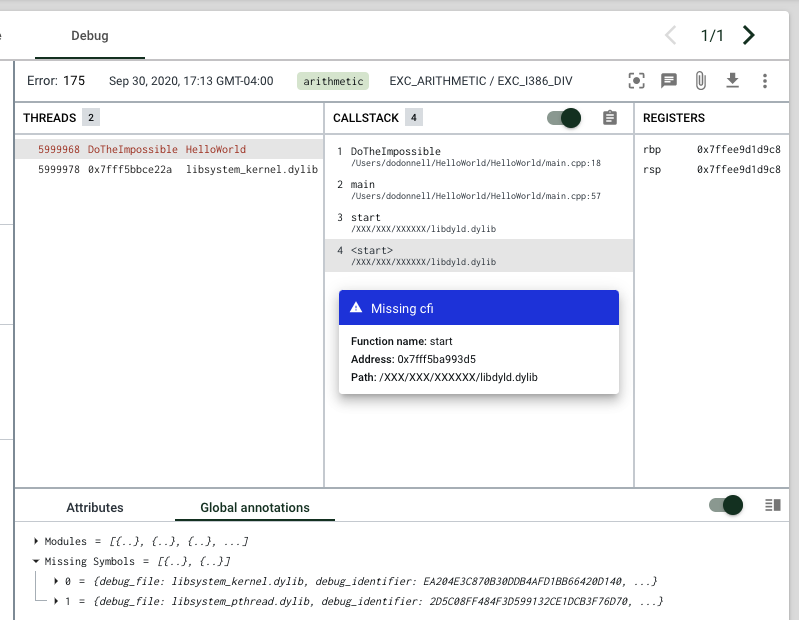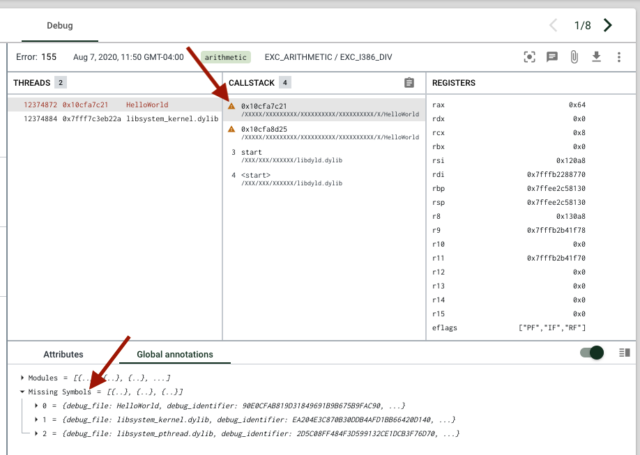 Backtrace indicates that a crash report is missing symbols by setting an attribute, _missing_symbols, to 1, and in the debug view UI (in the callstack and the global annotations sections).