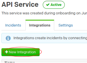 Within PagerDuty, click on the Configuration menu at the top, then select Services. Select the API Service (create it using the Add New Service button if it doesn't yet exist), then click the Integrations tab. Click the green New Integration button: