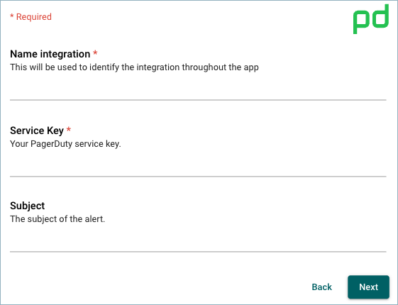 Select PagerDuty and fill in the required settings (name, service key, and alert subject).
