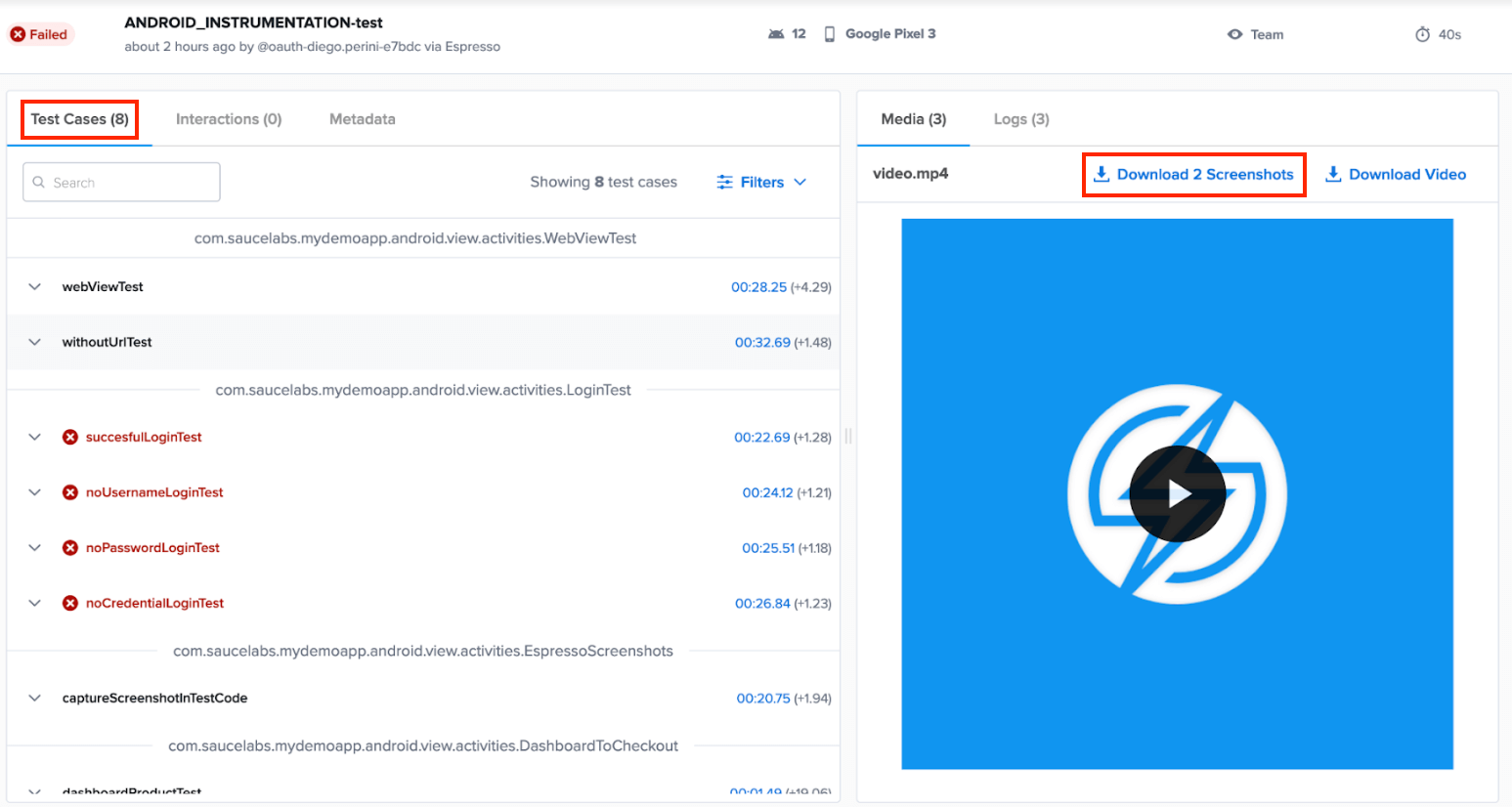 2. After the test has run successfully, on the Test Cases page, click the Download Screenshots tab to download a .zip file with all the screenshots for each test case as shown below:
