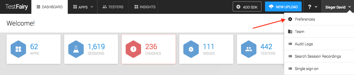 On the Sauce Labs Mobile App Distribution dashboard, navigate to the Preferences.