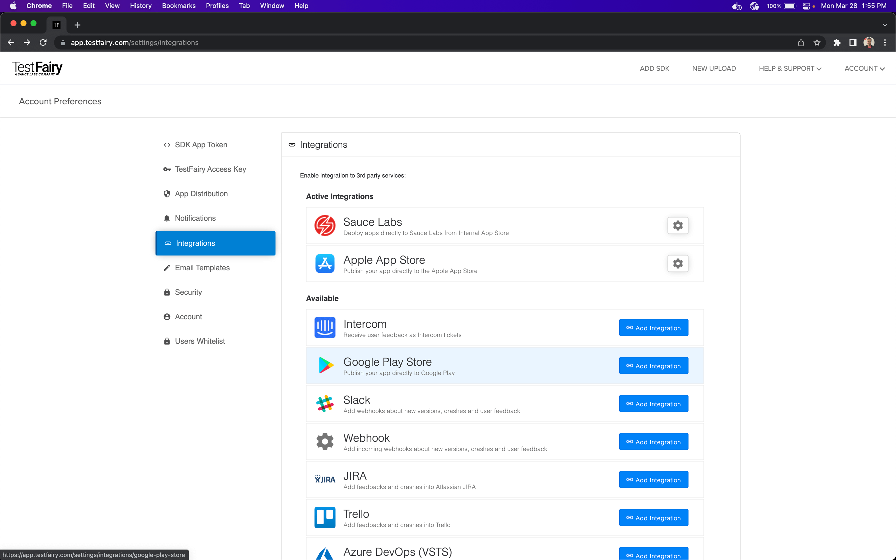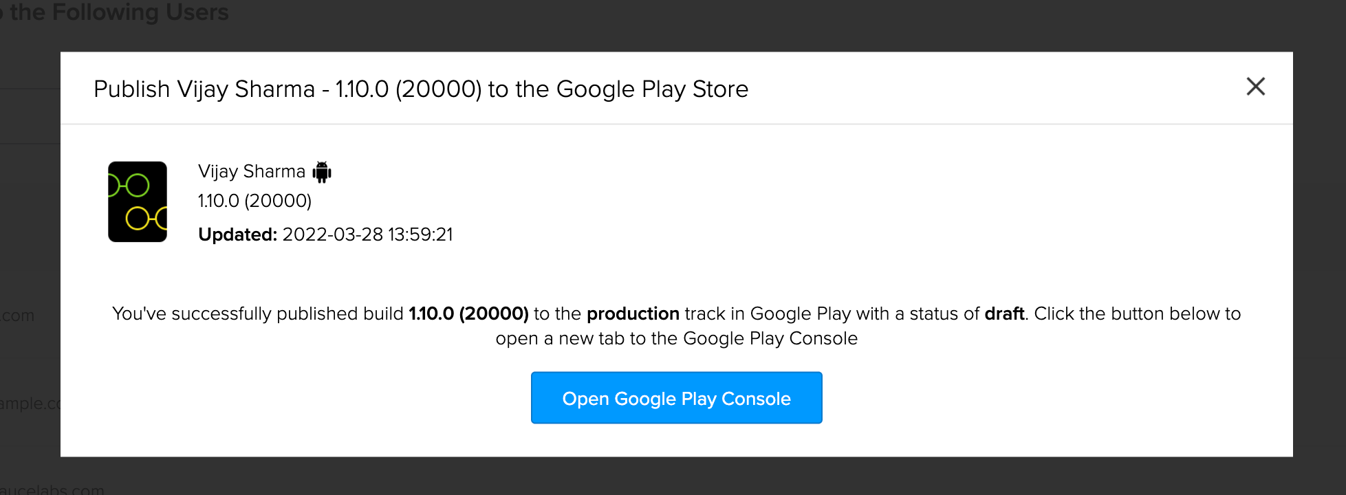 Sauce Labs Mobile App Distribution allows you to upload your production app directory to the Google Play Store.