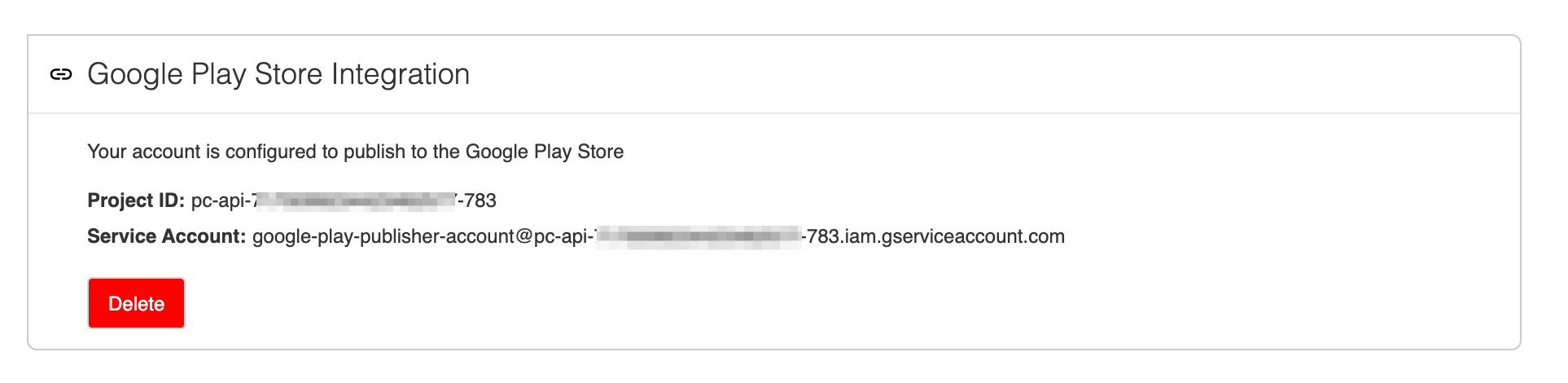 Once uploaded, you can see the associated Project ID and Service account on the integration page. Verify the account matches the one in Google Play Console.