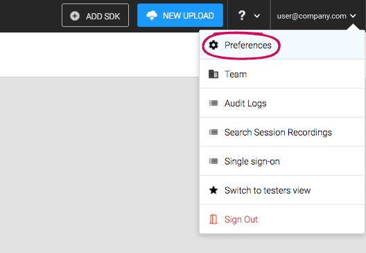 From your account at Sauce Labs Mobile App Distribution, go to Preferences.