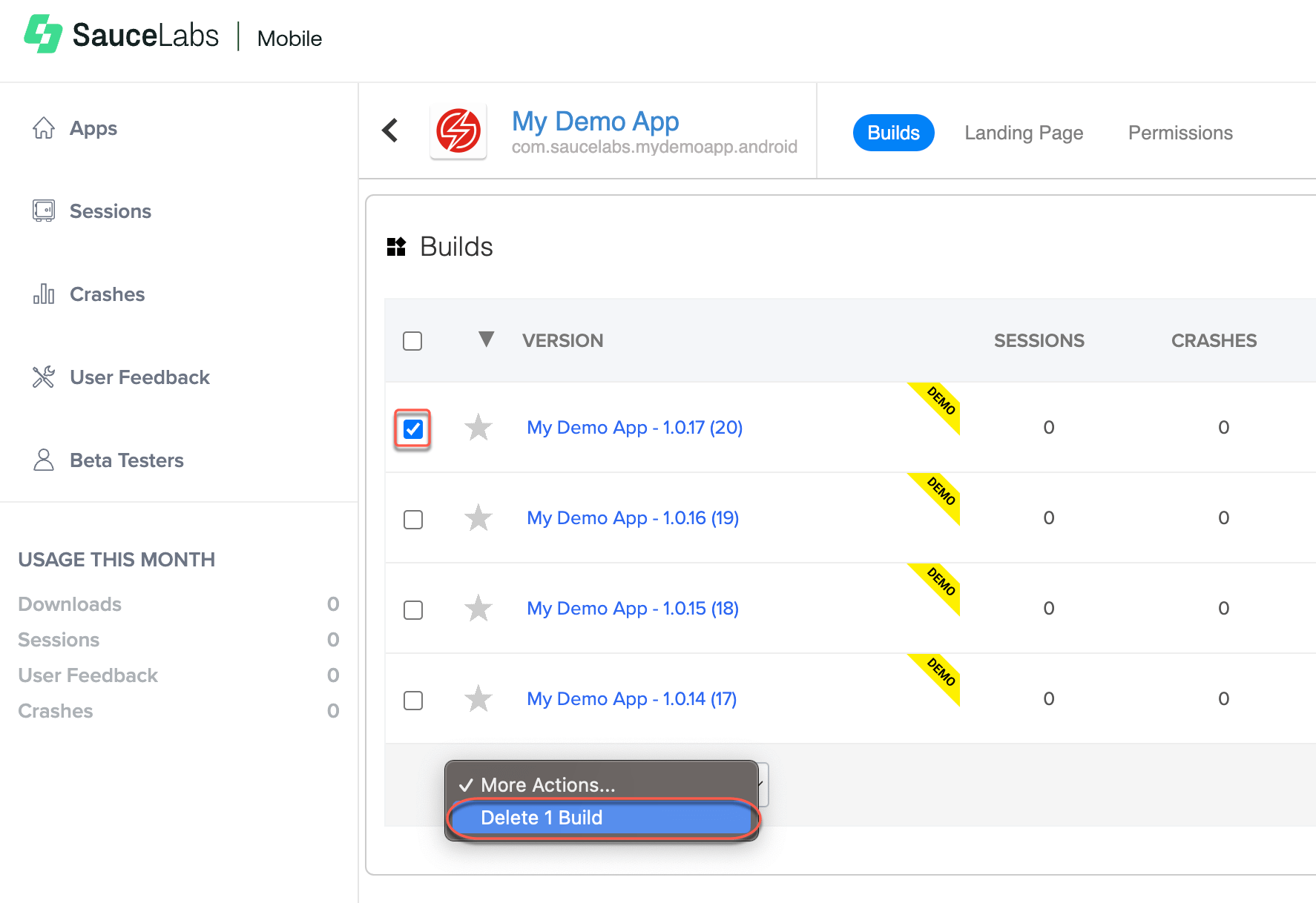 To delete a build from the system, select the checkbox and, in the More Actions… dropdown list, click Delete Build.