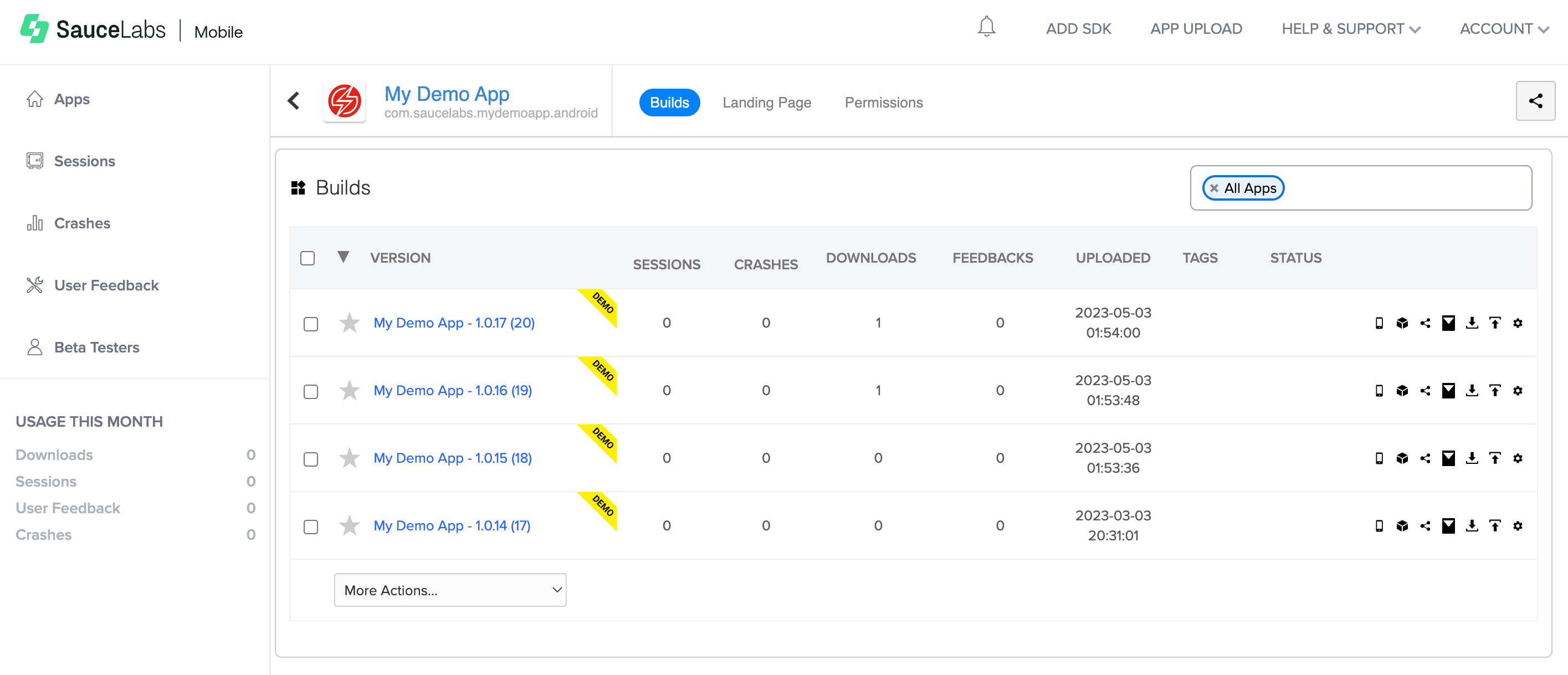 To access the build menu, click Apps on your Sauce Labs Mobile App Distribution Dashboard and select the App from the list.