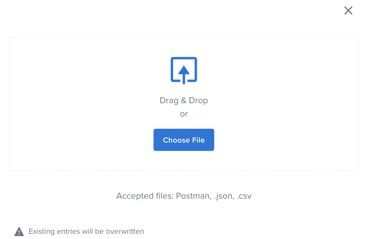 • Import an existing environment by clicking Import > Choose File (accepted file types are Postman, .json, .csv).
