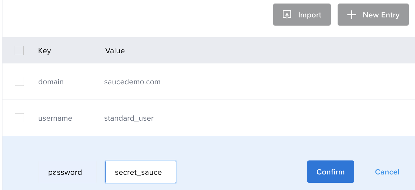 • Add variable(s) manually by clicking New Entry > Enter Key and Value pairs > Confirm.