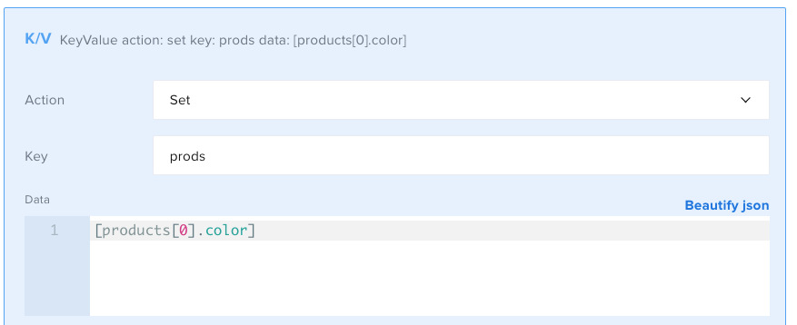 This step assigns a key in the Key/Value Store to a value from the response payload. In this case, use color, which is an array.