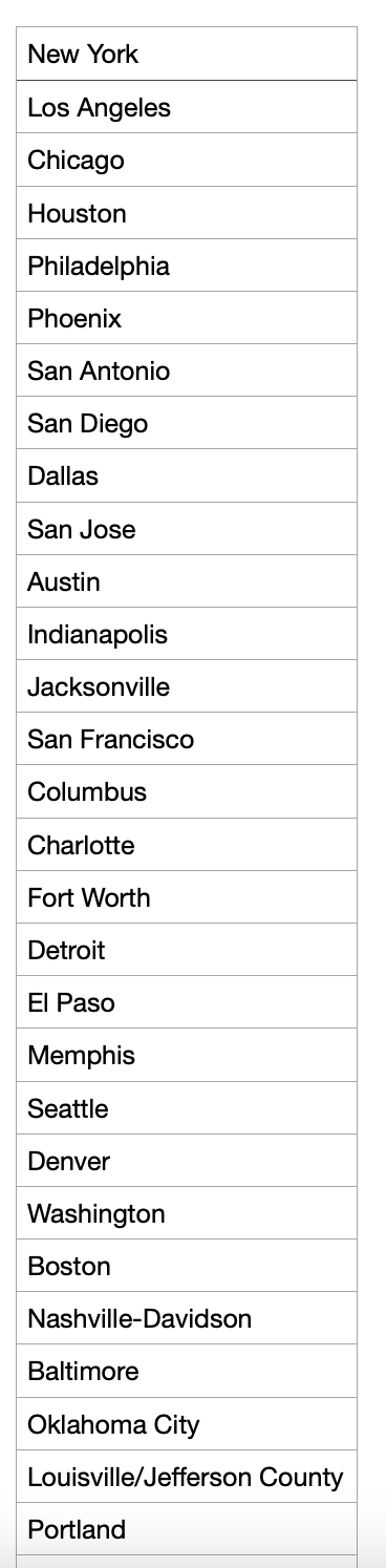 This example uses the cities.csv file that contains a list of US cities as shown: