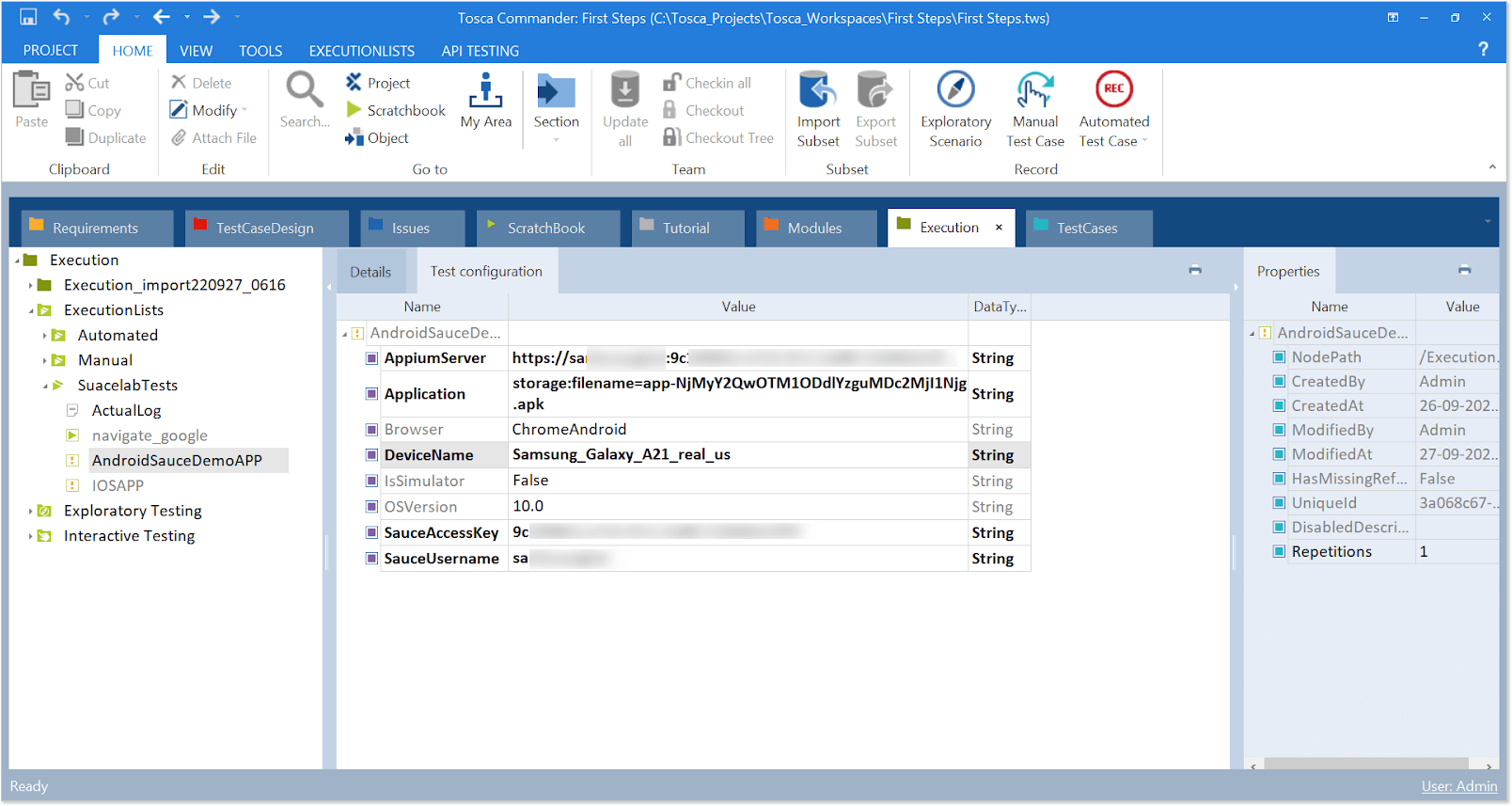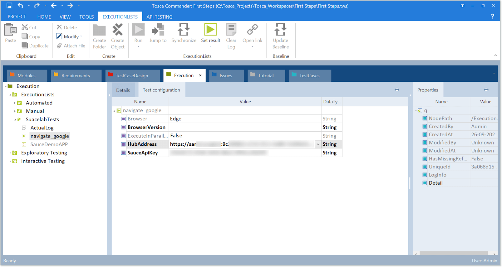 - In the Tosca Commander, on the Execution tab, enter your Sauce Labs credentials.