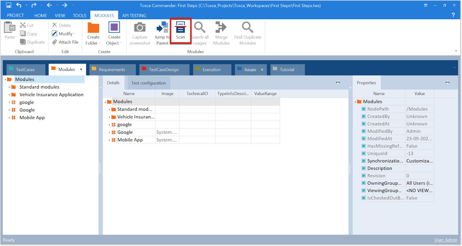 - In the Tosca Commander, on the Modules tab, click Scan and then click Mobile.