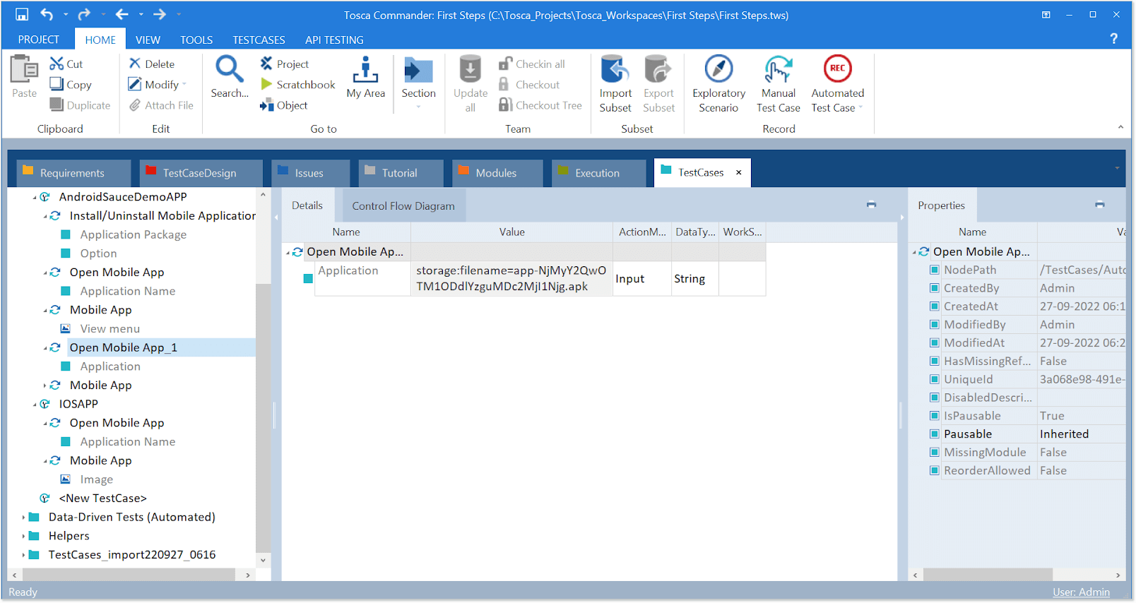 - On the Test Cases tab, in the Application field under Open Mobile App, enter the
