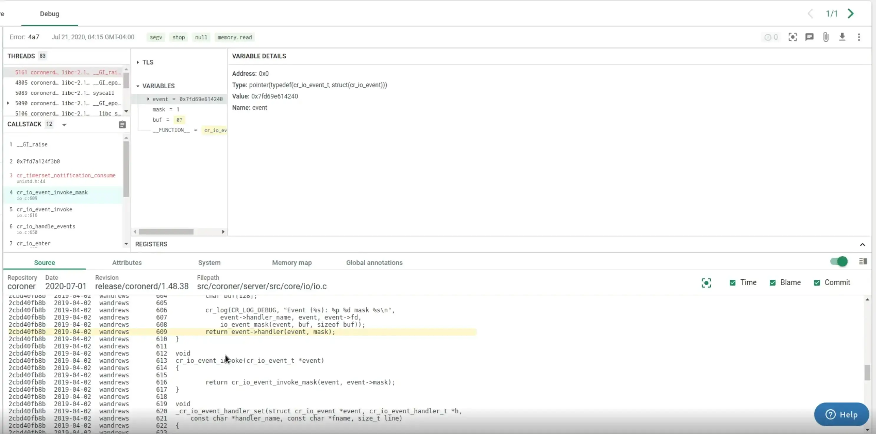 An engineer who is using the Backtrace Debugger to root cause an issue will find it useful to see source code that is associated with frames in the stack trace. Backtrace has provided a Source Code Integration Service to support this.
