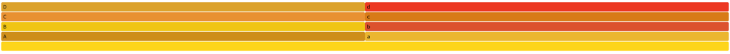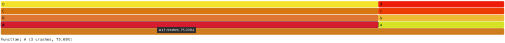 The X-axis is now divided by both stack traces. As there is one stack trace sample of a -> b -> c -> d and one stack trace sample of A -> B -> C -> D, the X-axis is evenly divided across the two sequences. Let us introduce two more samples of A -> B -> C -> D such that there are a total of three samples of A -> B -> C -> D and one sample with a -> b -> c -> d. The result is below: