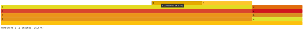 Note, in the interactive version of the visualization, mousing over a rectangle tells you the sample count. In this case, 3 samples with that stack sequence involved a function call into A. Let us now introduce two more stack traces into the visualization, A -> B -> C -> D -> E and A -> B -> C -> D -> F.