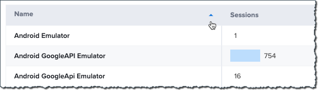 As the image shows, sorting by the Name column sorts the data alphabetically by the name of the browser, device or OS, allowing you to quickly discern how much coverage a particular environment has in your testing.
