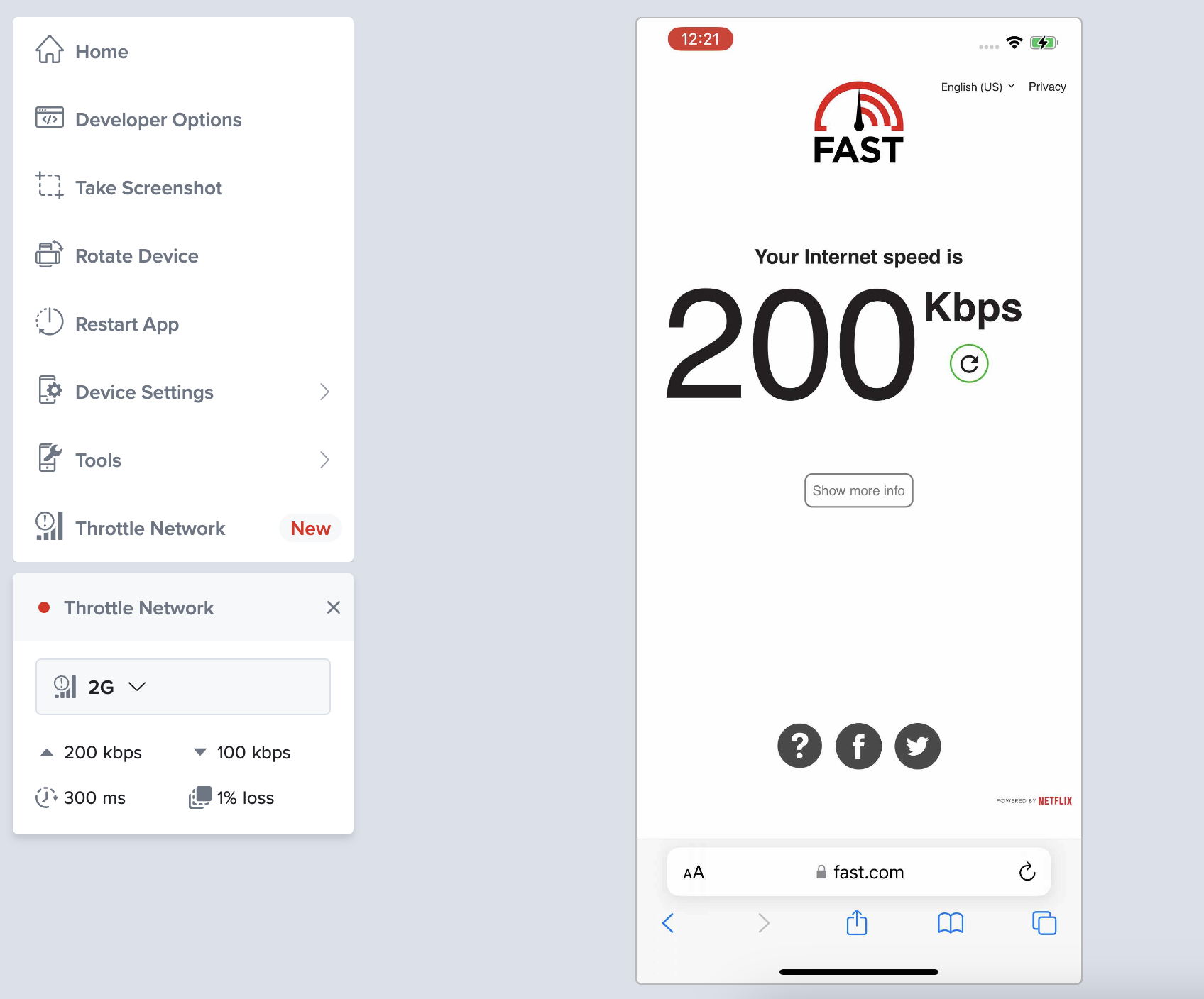 - In the live test window, in the left toolbar, click Throttle Network to open the network throttling tool.