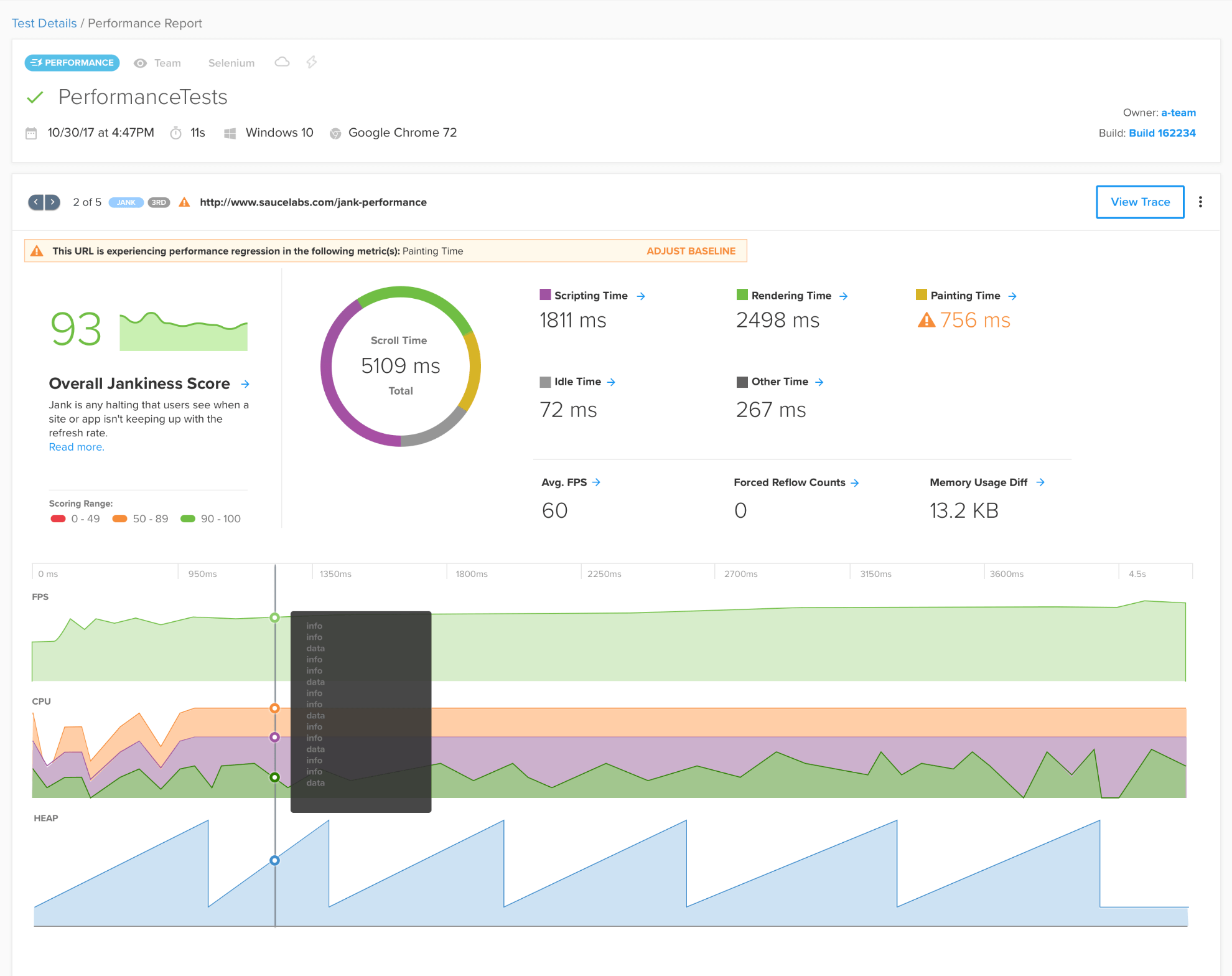 In addition to testing the efficiency of your app rendering, Sauce Labs also provides a means for testing how a single page performs in motion, such as while scrolling or tabbing.